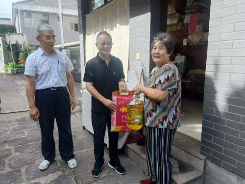 高文祥同志(照片,中)是我們支部黨齡最長的老黨員,也是退伍老軍人,2023年就獲得了光榮在黨五十年紀(jì)念章,今天老早就來到了支部辦公室,精神抖擻地準(zhǔn)備參加送溫暖活動。上面照片,他正向張婉芳送米油。
