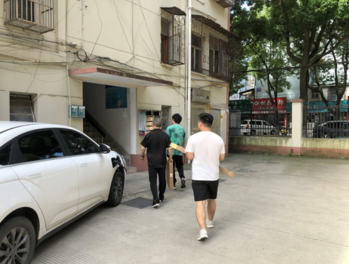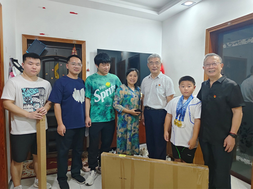 向富北6小區(qū)符愛芳家庭送上小型花架。家里九周歲的孫子符鈞豪剛昨天在杭州獲得了武術(shù)表演金牌